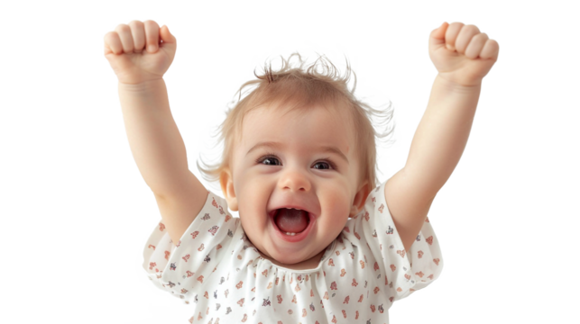 Adorable baby bursts with joy, arms raised in a triumphant celebration of happiness
