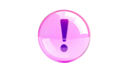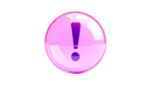 A translucent, spherical object, rendered with glossy gradients in pink and purple, featuring a central exclamation mark. Black background