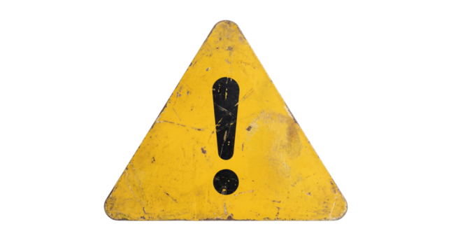 Grungy weathered yellow warning sign featuring a prominent black exclamation mark on transparent background