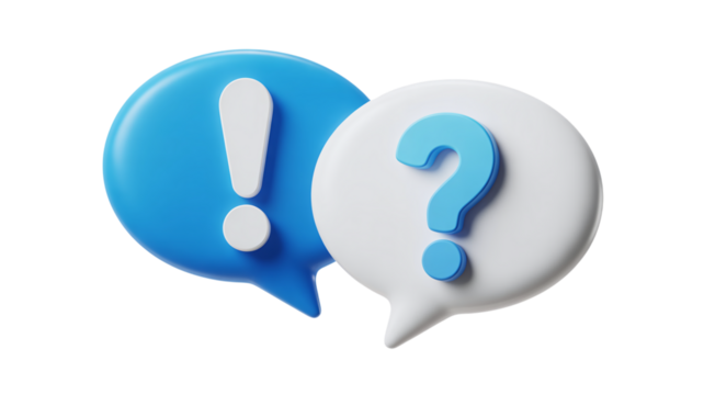 Two 3d speech bubbles with exclamation mark and question mark symbols communicating ideas and questions