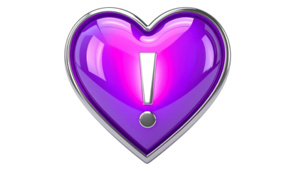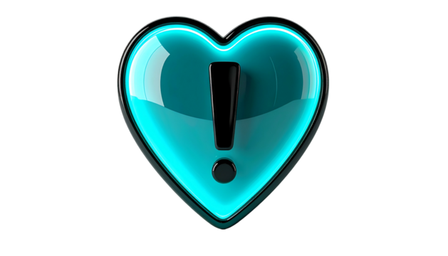 A vibrant teal-colored heart shape, outlined in bright neon, features a black exclamation point in its center, against a stark, black background