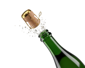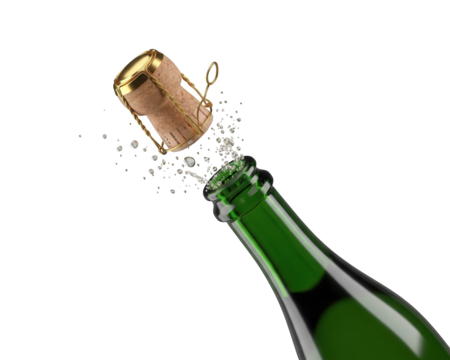 Cork violently ejects from the neck of a green glass bottle releasing effervescent spray
