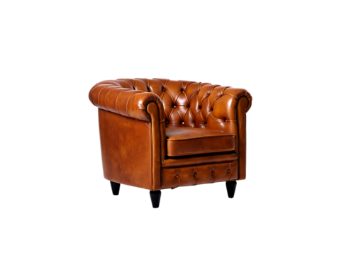 Elegant Brown Leather Chesterfield Armchair, Luxurious and timeless single seater chair on a black background