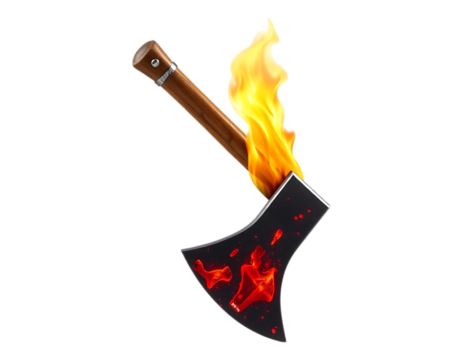 Photorealistic 3d render of a battle-worn executioner's wrought iron axe blade showing extreme oxidation and pitting, dark oak handle, on white background. concept of historical antiquity