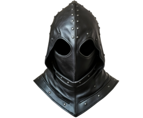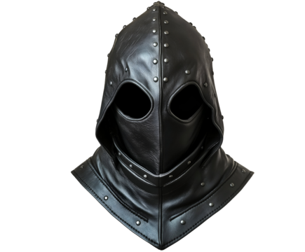 medieval executioner's hood with rivet detailing in black leather isolated background