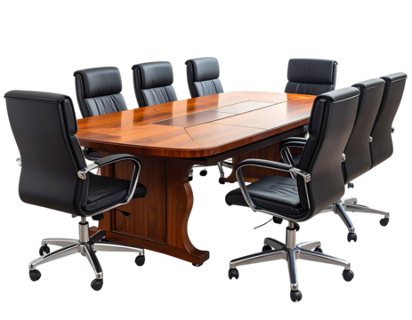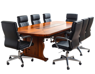 Elegant wooden conference table with executive chairs arranged around it isolated on transparent background