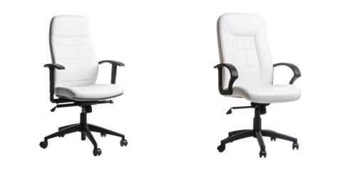 A modern, white leather executive office chair with a swivel base and metallic accents, isolated on a clean white background.