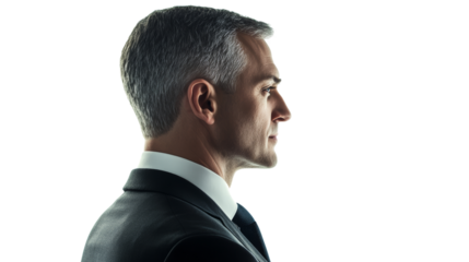 Profile portrait of a middle-aged man in a suit, depicting professionalism and confidence against a white isolated background.