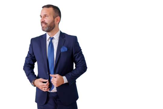 Confident businessman looking away, successful professional wearing a blue suit and tie, smiling on a transparent background