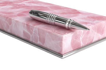 Elegant Silver Pen on Textured Pink Marble Block With Reflective Metal Trim in a Studio Shot Isolated on a Transparent Background with Clean Detailing For Presentation and Mockups