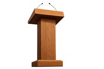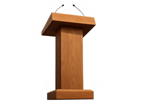 Wooden lectern with microphones, symbol of public speaking, conference communication, and academic presentations