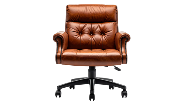 Elegant, tufted brown leather executive office chair on a black wheeled base