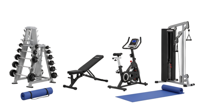 Gym equipment including weight rack, bench, exercise bike, cable machine, and mats isolated on Transparent background