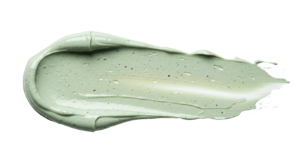 A thick, richly textured smear of light green cosmetic product with dark exfoliating particles, spread horizontally on a transparent background, studio lighting, purity and freshness skincare