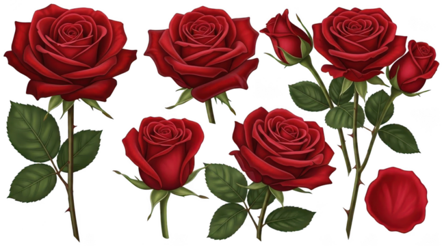 Vibrant, realistically rendered red roses with lush green foliage and detailed petal textures gracefully stand upright, exhibiting a slightly glossy sheen under, isolated on transparent background.