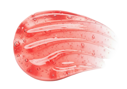 extreme close-up of vibrant coral pink viscous cosmetic gel swatch, exhibiting glossy ridges and air bubbles against a transparent background. concept for luxury beauty product advertising