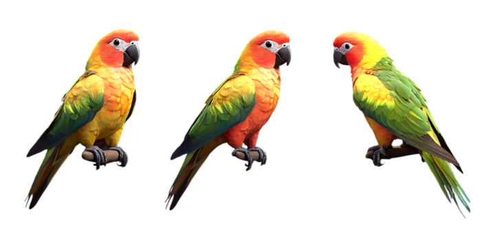 Three colorful Sun Conure parrots perch together displaying tropical plumage isolated on a transparent background ideal for banner promotion.