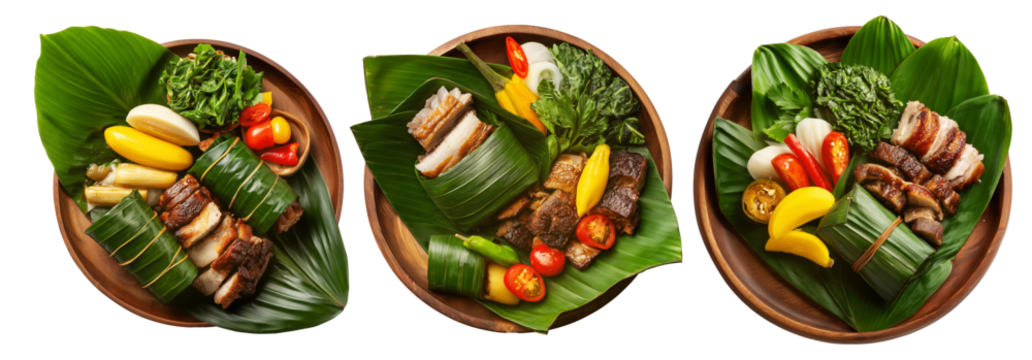Mumu Pit-baked pork, taro, banana, and vegetables in banana leaves on wooden plate isolated on white background