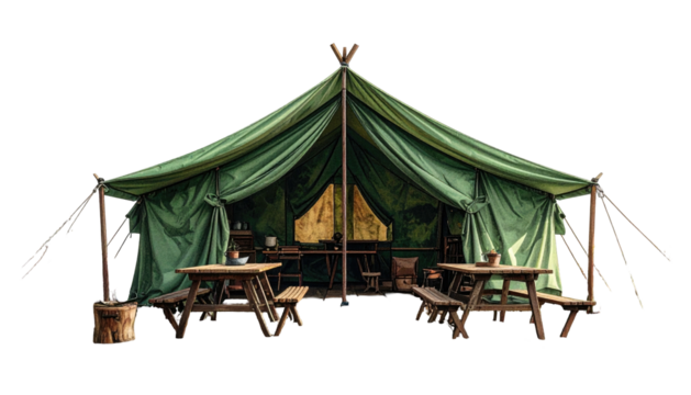A green canvas tent with picnic tables and wooden furniture, inviting