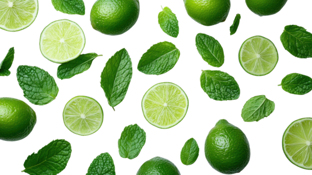 Vibrant green lime fruits with mint leaves , isolated and perfectly sliced, offer a fresh, juicy, and healthy citrus experience