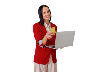 Woman holding credit card and laptop, smiling, enjoying secure online shopping and e-commerce payment experience