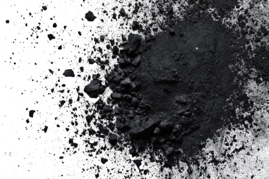 Black powder speckled with small black particles on isolated background. Close-up view of charcoal dust, gunpowder texture. No text or objects, powder at center, alpha backdrop extending to edges. Png