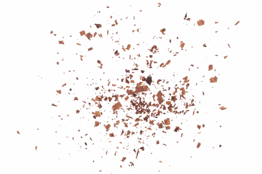 Levitating milk chocolate bar pieces isolated on white background. Pattern. Crumbs, shavings and Flying Chocolate chunks Top view. Flat lay isolated on a white background