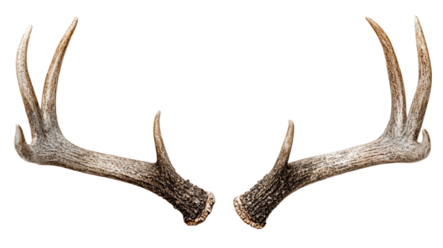 Isolated white background photograph of brown wild deer antlers used as a hunting trophy