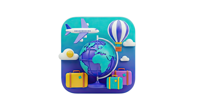 Travel Icon: Airplane, Globe, Suitcases & Balloon