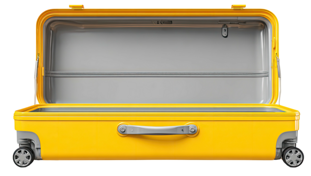 Open, yellow travel case, front view, with gray interior, handle and wheels for easy mobility