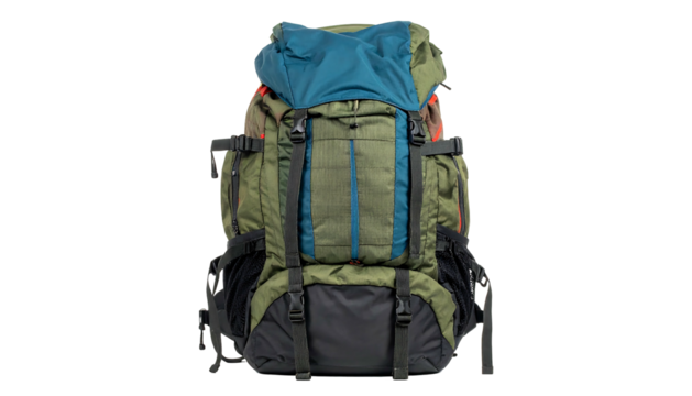 Large Green and Blue Hiking Backpack on White Background.