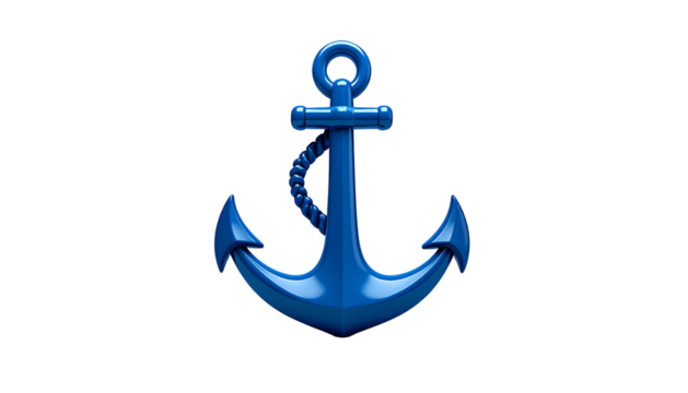 A 3D render of a classic, shiny blue nautical anchor with rope, set against a stark black background