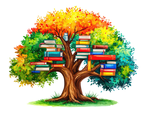 Watercolor illustration of a tree whose branches are replaced with colorful, stacked books