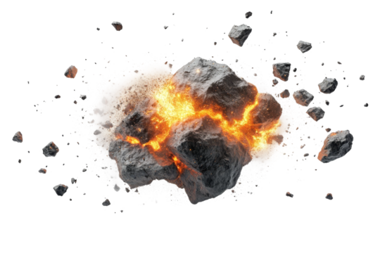Explosive rock shattering with fiery bursts and flying debris in dynamic action against a transparent background
