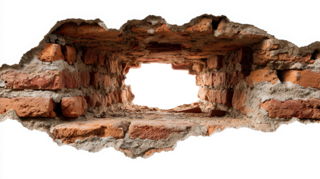 Crumbling brick wall with sizeable opening, exposing transparent background and offering generous space for graphic design, highlighting architectural decay and textural details