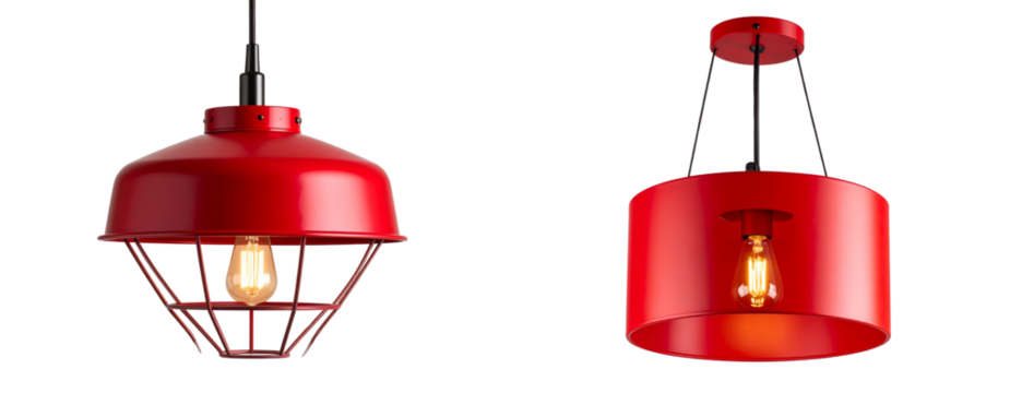 Hanging red pendant lamp with exposed bulb, downward angle, isolated PNG