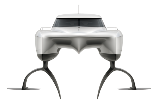 Sleek catamaran featuring an aerodynamic upper deck and exposed hydrofoils.