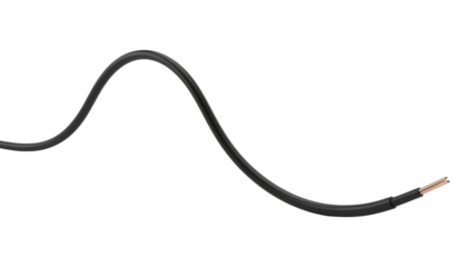 A closeup of a cut electrical cable with exposed wires and shielding, isolated on transparent background
