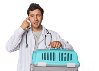 Young Hispanic man as vet with cage showing a disappointment gesture with forefinger.