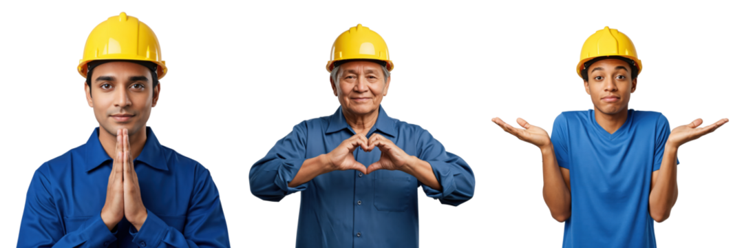 Diverse group of three male construction workers, young and senior, wearing yellow hard hats and blue uniforms, expressing various emotions and gestures against a transparent background.