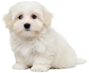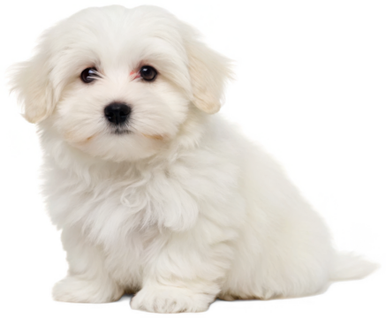 Adorable fluffy white Maltese puppy with dark, expressive eyes and a small black nose, rendered in a realistic photographic style, is sitting attentively with a, isolated on transparent background.