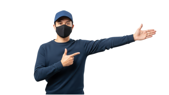 A delivery man wearing a face mask gestures towards a product on transparent background