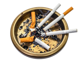 A close-up view of an ashtray filled with extinguished and lit cigarettes