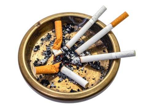 Extinguished cigarette butt resting in ash symbolizes unhealthy habits and the struggle to quit, offering a somber yet powerful image