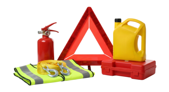 comprehensive automotive safety equipment set including fire extinguisher warning triangle and