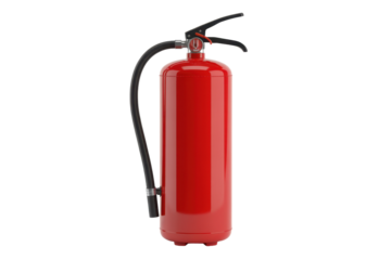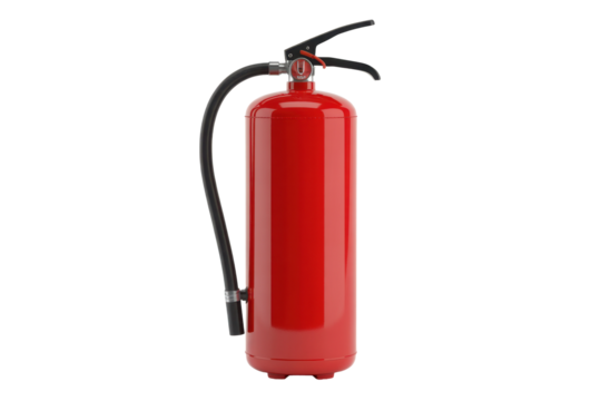 Red fire extinguisher with black nozzle and flame symbol isolated on a transparent background