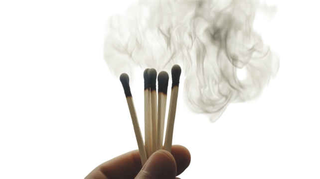 A hand holds extinguished matches, smoke curling up from their tips