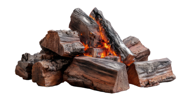 A partially extinguished pile of firewood logs, with flickering flames and soft glowing embers, isolated on transparent background