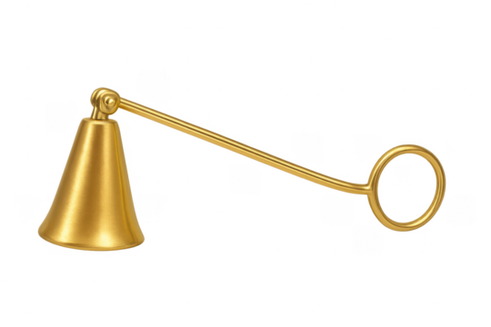 Elegant lavender taper candle with smoke isolated PNG, extinguished candle in gold holder on transparent background for design projects