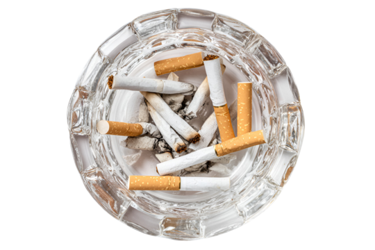 Glass ashtray filled with several extinguished cigarettes butts and ash